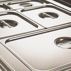 Contenitore vaschette in acciaio inox, isolato con poliuretano espanso ecologico iniettato monoblocco con densità 40 kg/metro cubo completa di resistenze elettriche corazzate. Pianetto posteriore di lavoro inox. Cristallo temperato curvo apribile verso il basso completo di plafoniera in alluminio. Quadro elettrico dotato di termostato meccanico e interruttori spia luminosi. Attrezzaggio per vaschette gastronomia ( vaschette escluse )